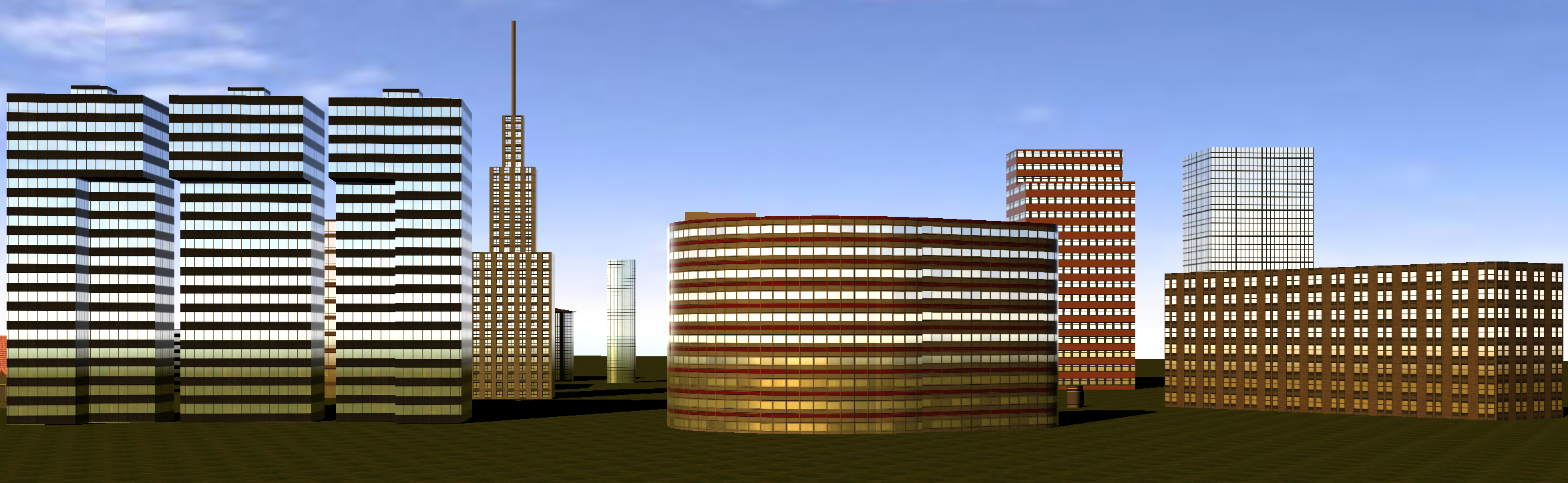 This image shows buildings reflecting the sky thanks to the same cubic texture the background cube map uses. Each of these buildings is a PROTO specially written to produce a specific type of edifice, to which a special - possibly user-defined - set of shaders is applied. In addition to the skydome, the ground texture is queried using a reflected ray on the surface to give the illusion of a floor. Lighting on the ground is therefore also computed during the same fragment pass, effectively making this approach a one-bounce raytracer.